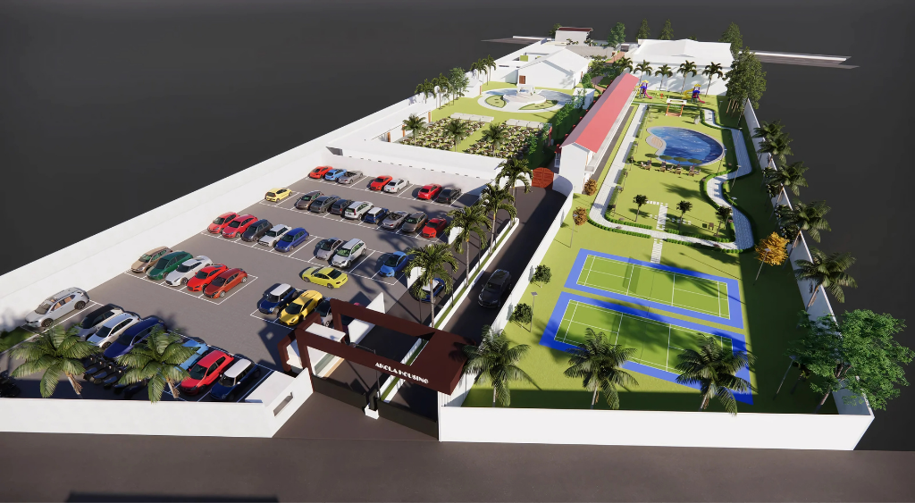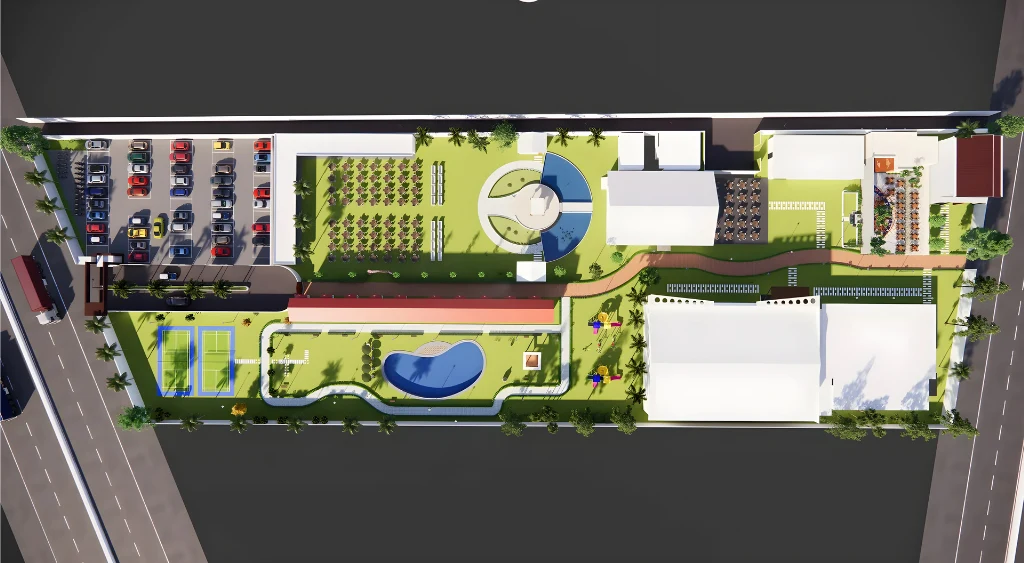 For special occasions, the resort features a grand marriage hall with dedicated bride and groom suites, complemented by landscaped pathways and open dining areas. Leisure unfolds at every corner — from the swimming pool and shaded garden seating, to kids’ play zones and a tennis court for the active soul.
